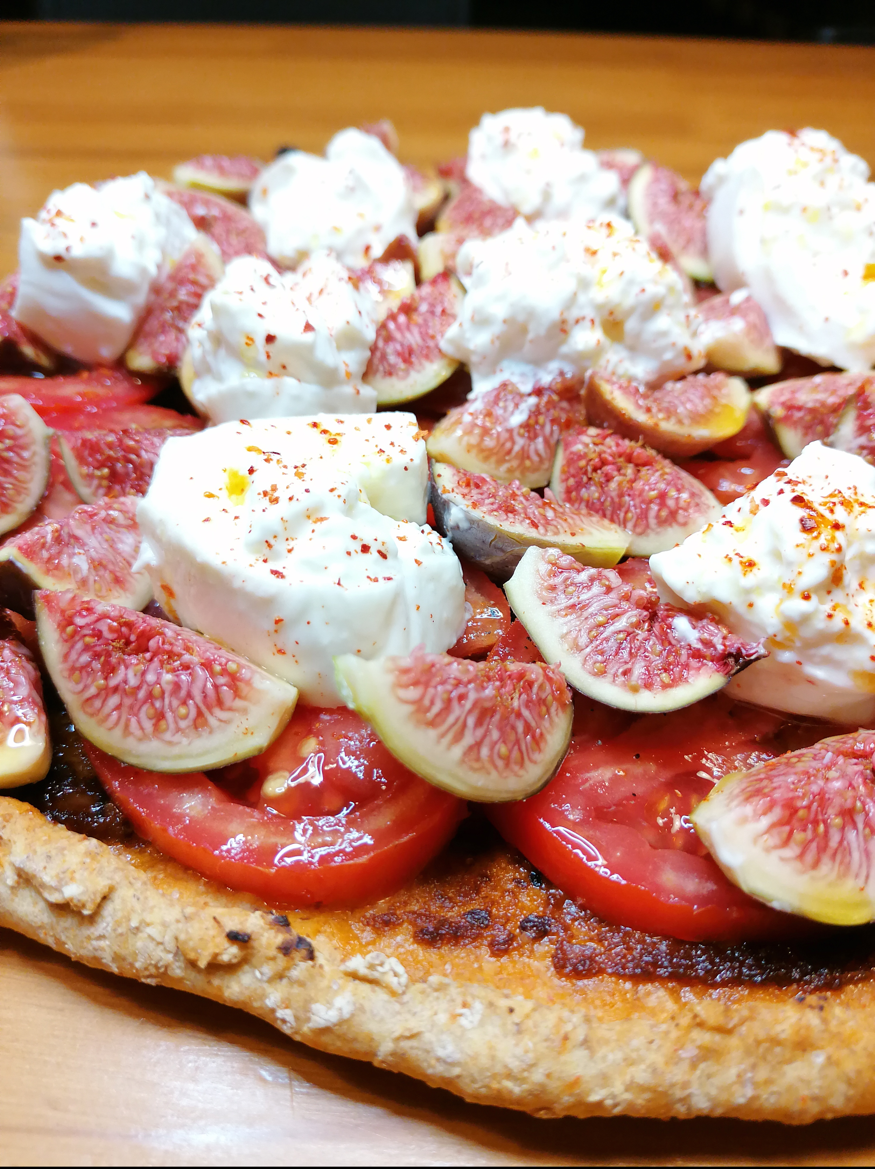 Pendant que la pâte refroidit, réalisez de belles tranches de tomate, coupez les figues en quartier et coupez la burrata en gros morceaux.