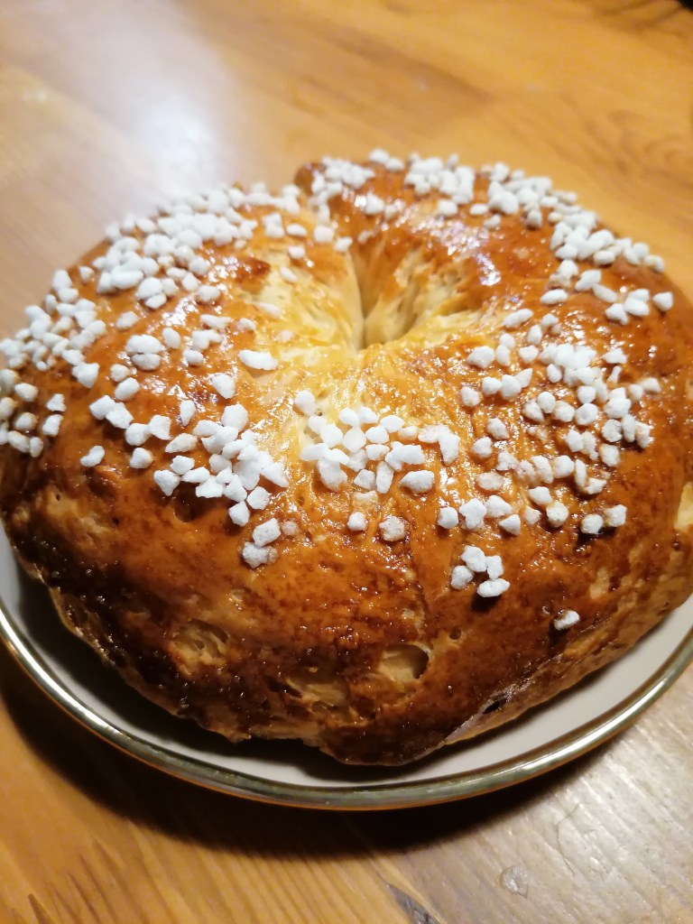 Badigeonnez la couronne d’un œuf battu à l’aide d’un pinceau et déposez quelques perles de sucre sur le dessus. Enfournez pendant 25 minutes.