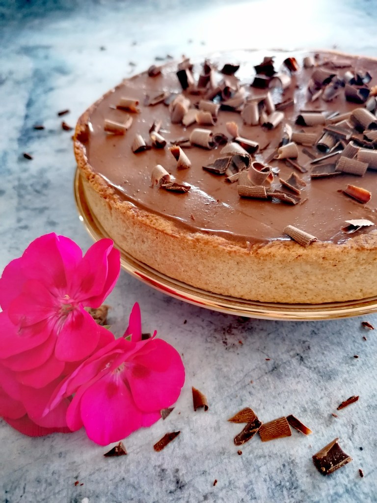 Une fois la pâte cuite et refroidie, versez la ganache sur le fond et lissez. Vous pouvez râper un peu de chocolat sur le dessus pour décorer.
